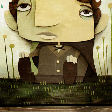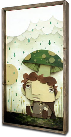 "Mushroom Umbrella" 2010 24x40, Mixex Media on wood. There's nothing quite like a mushroom to keep the rain at bay. Especially a green one with orange spots on it. That's the kind of mushroom I would choose.